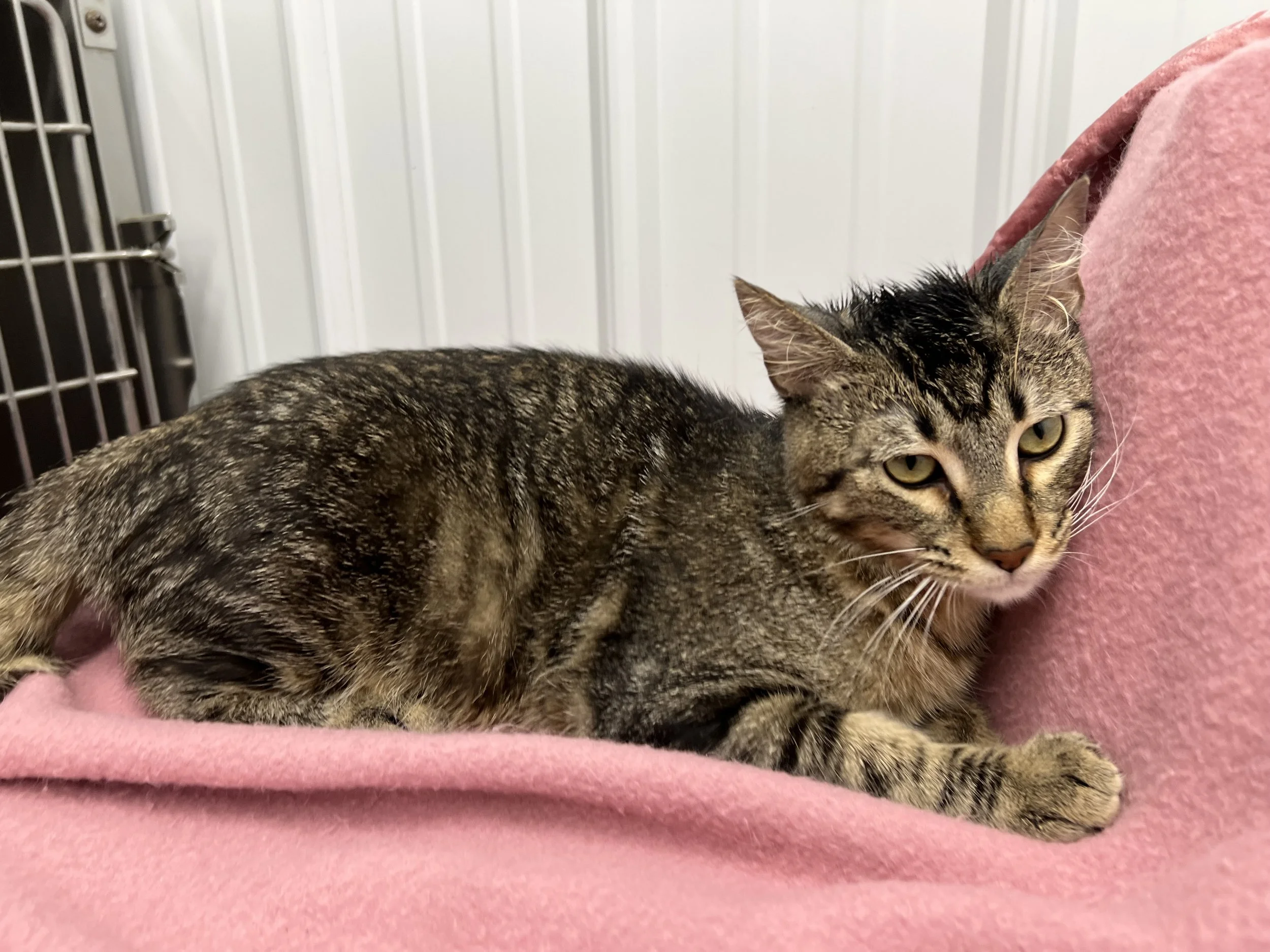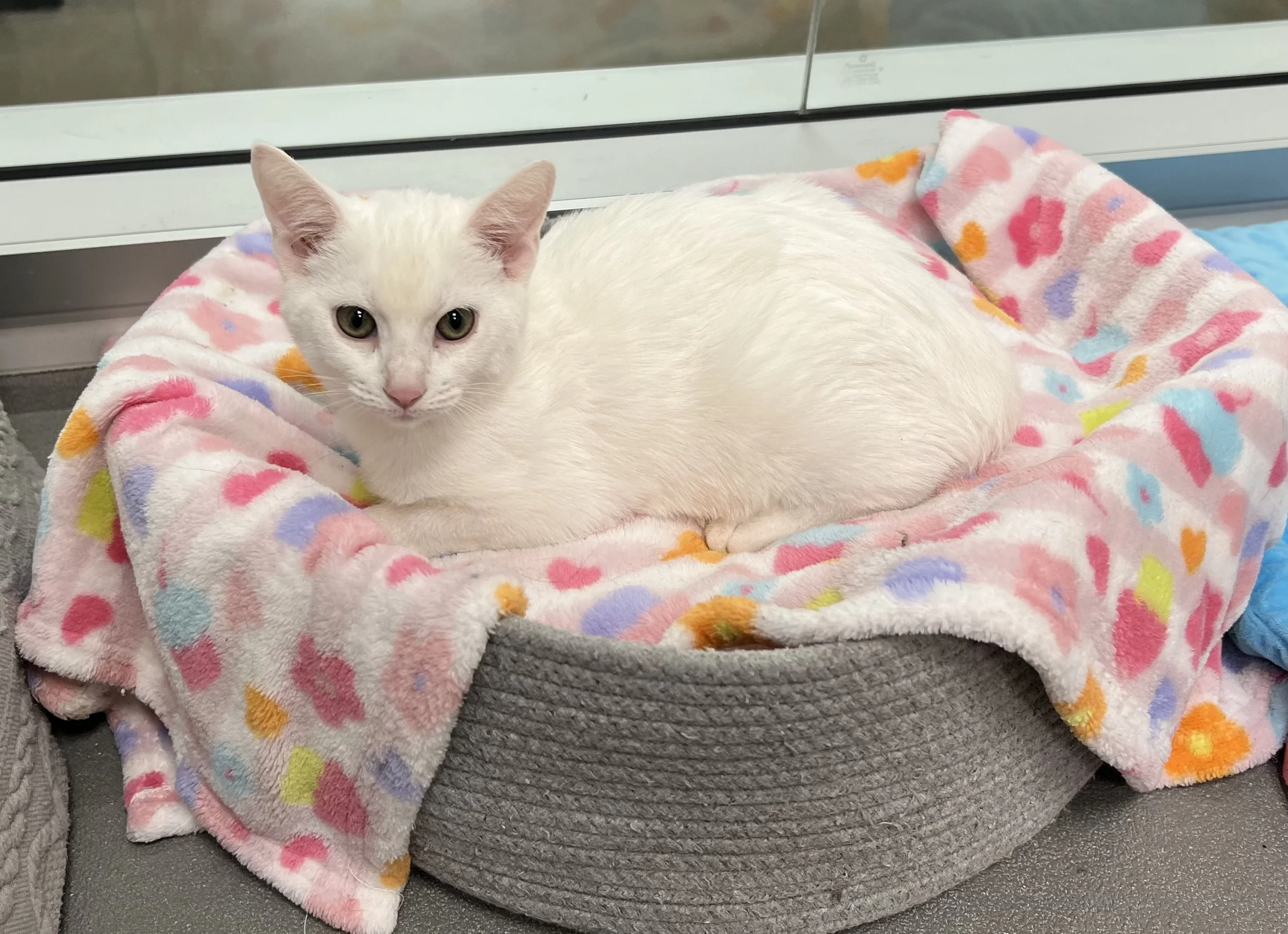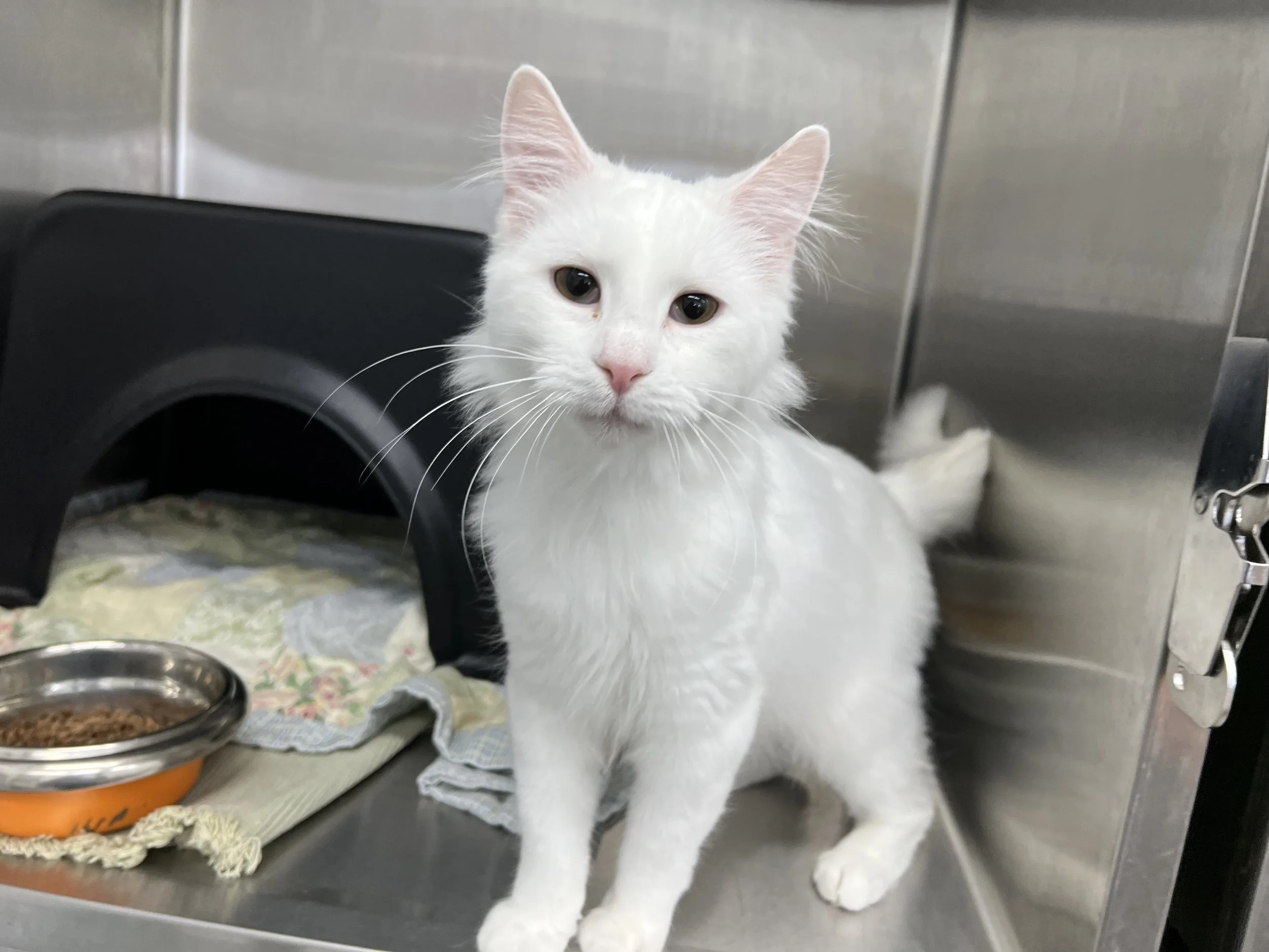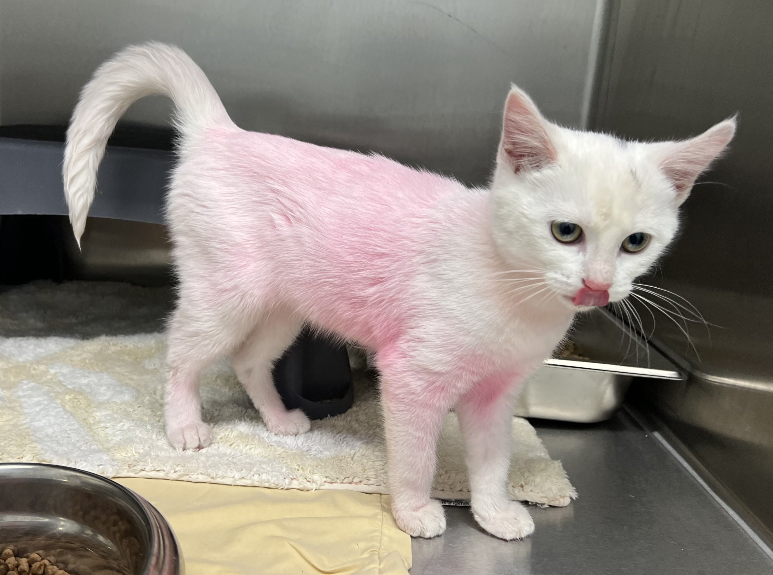 Paris is a sweet female kitten, approximately 4 months old. In a first for the Shelter, Paris came to us dyed pink. According to our research, the dye should wear off eventually with bathing and natural shedding. Regardless, she is a beautiful little girl who needs a loving, forever home.
