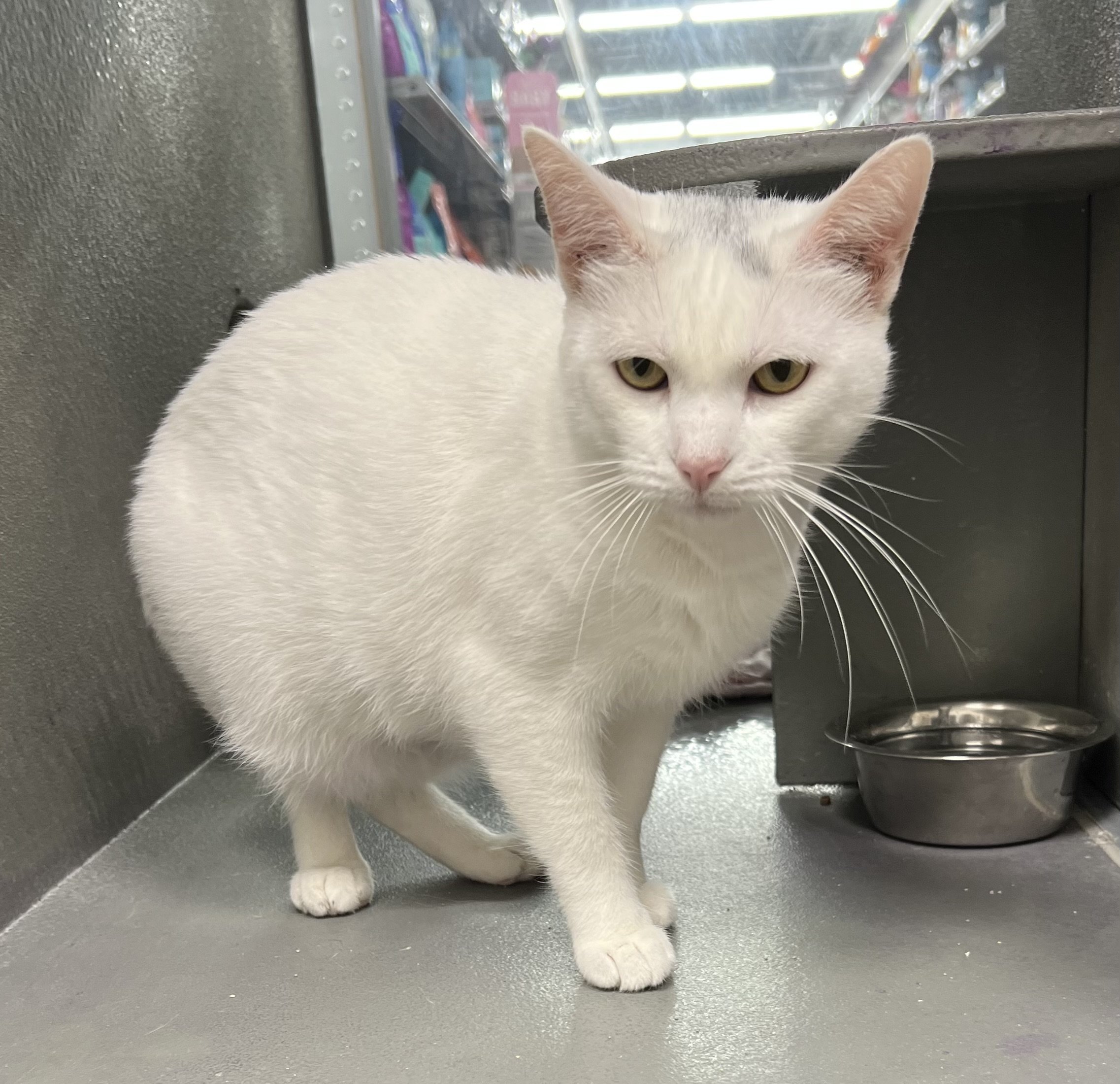 Color: White, with green eyes (currently dyed pink) (She has a faint dark spot on her head)