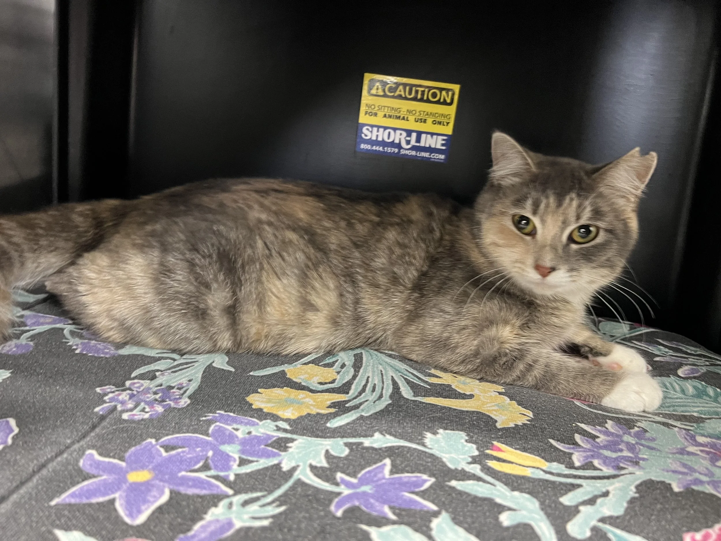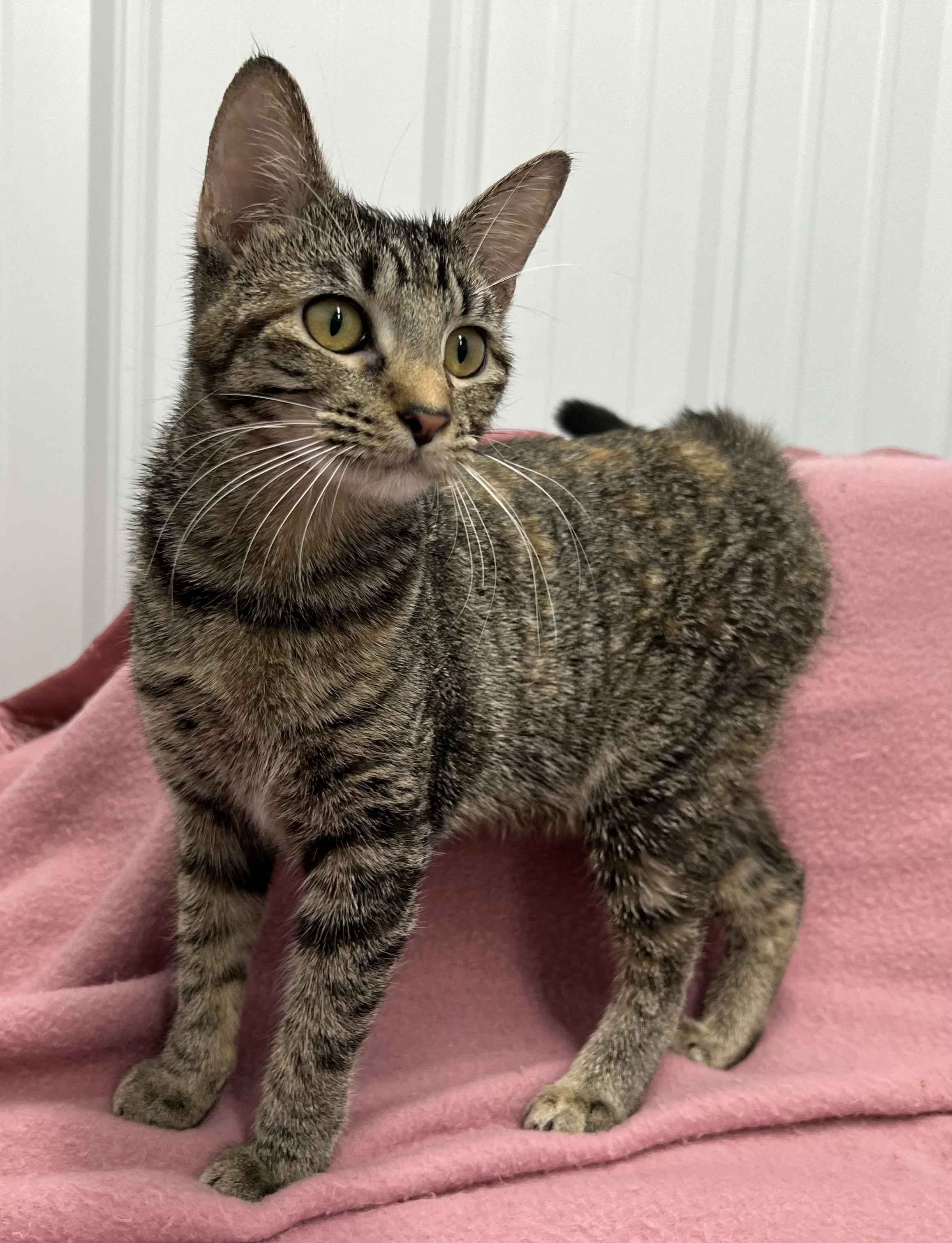 Presley is a pretty girl. Her fur is a combination of tabby stripe with tortoiseshell color spots. She is quiet and friendly. She is approximately 8 months old. She can be adopted once she is spayed and has her shots.