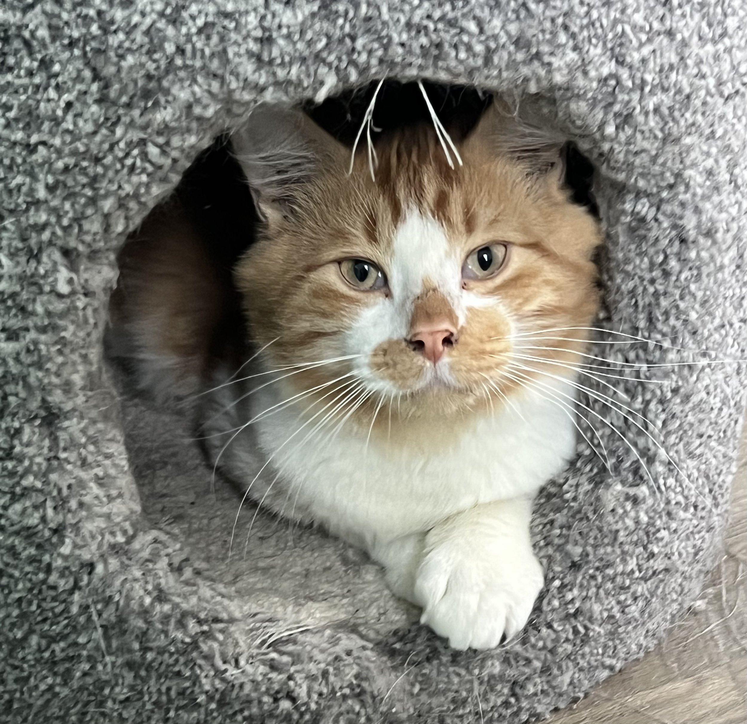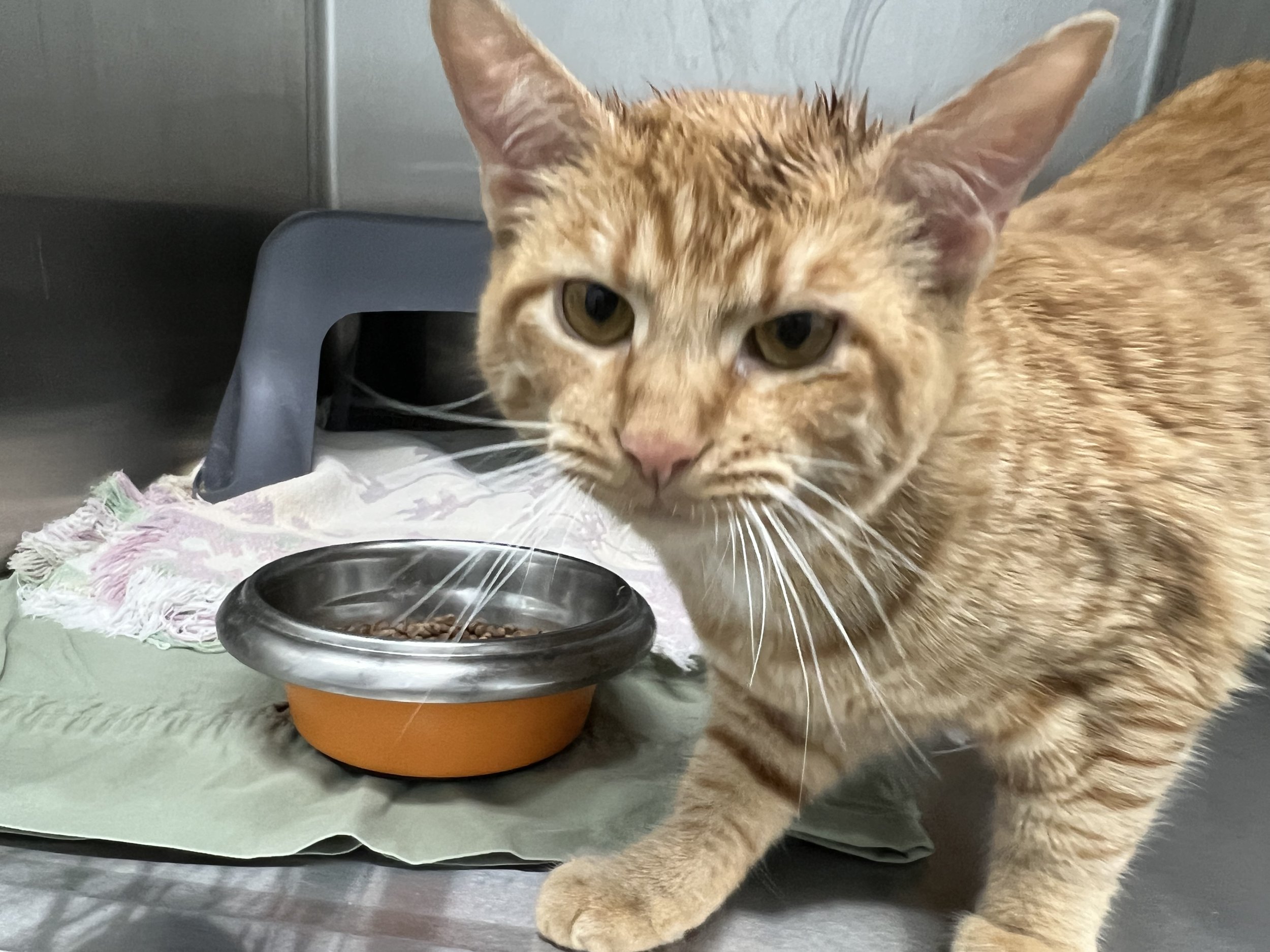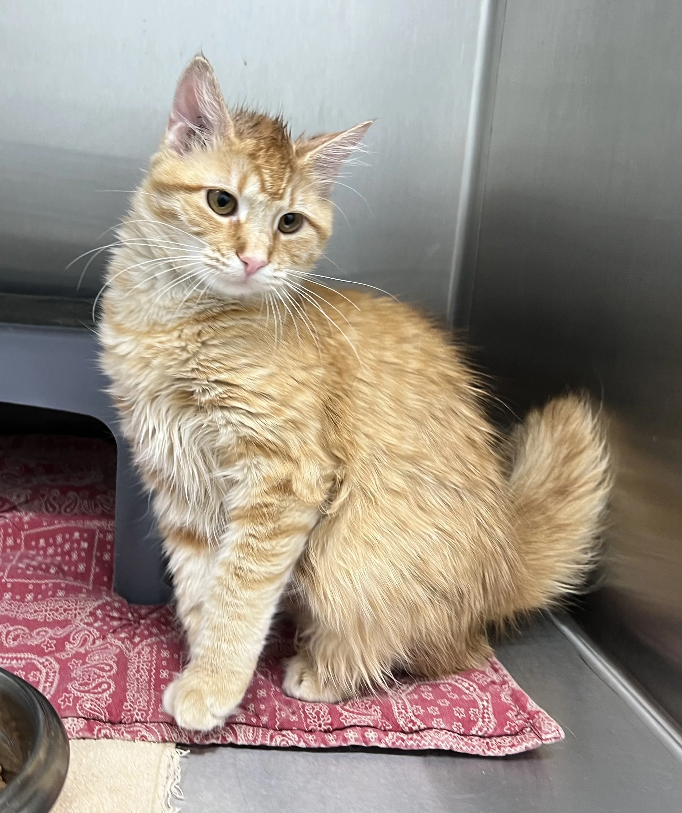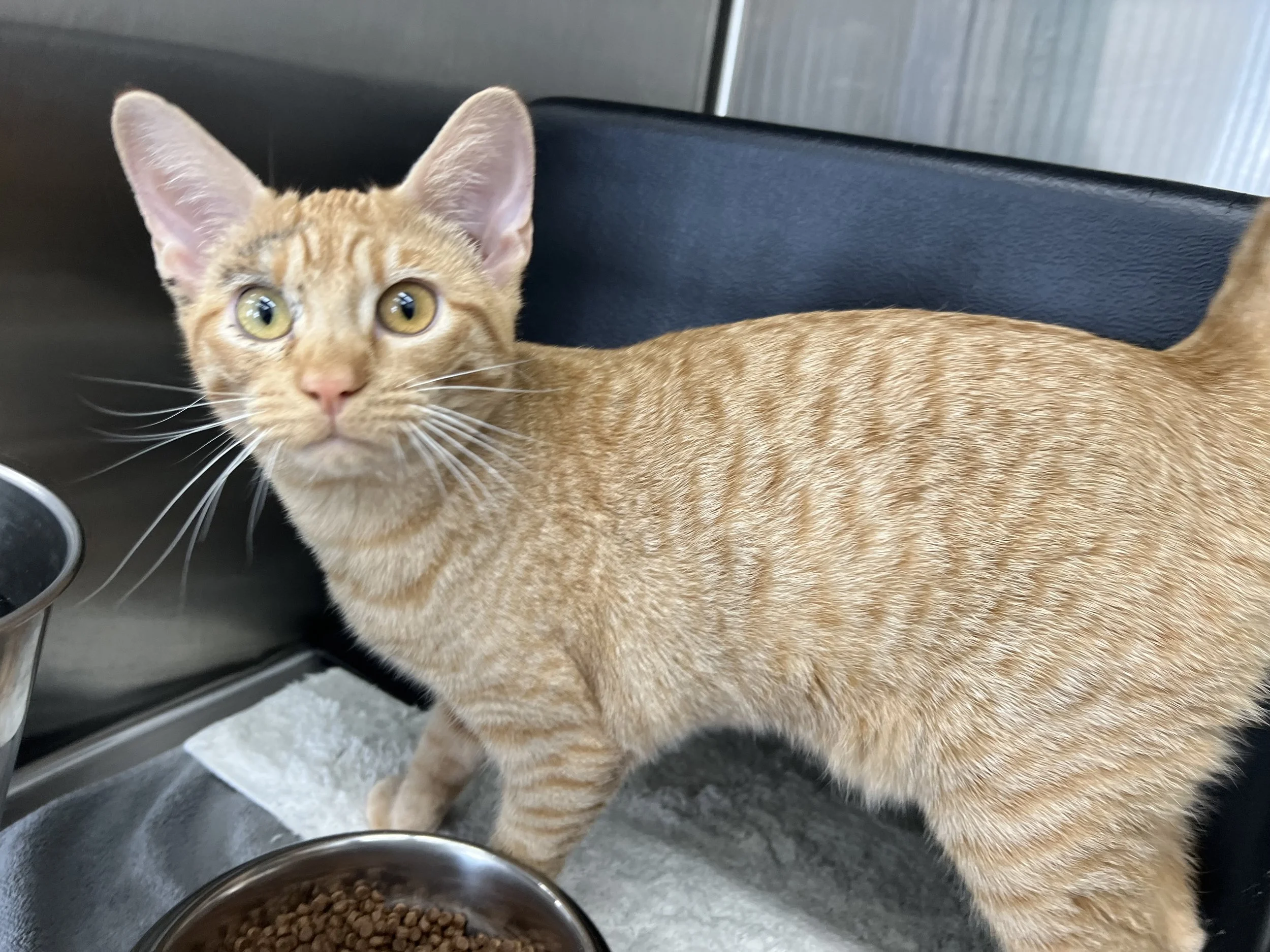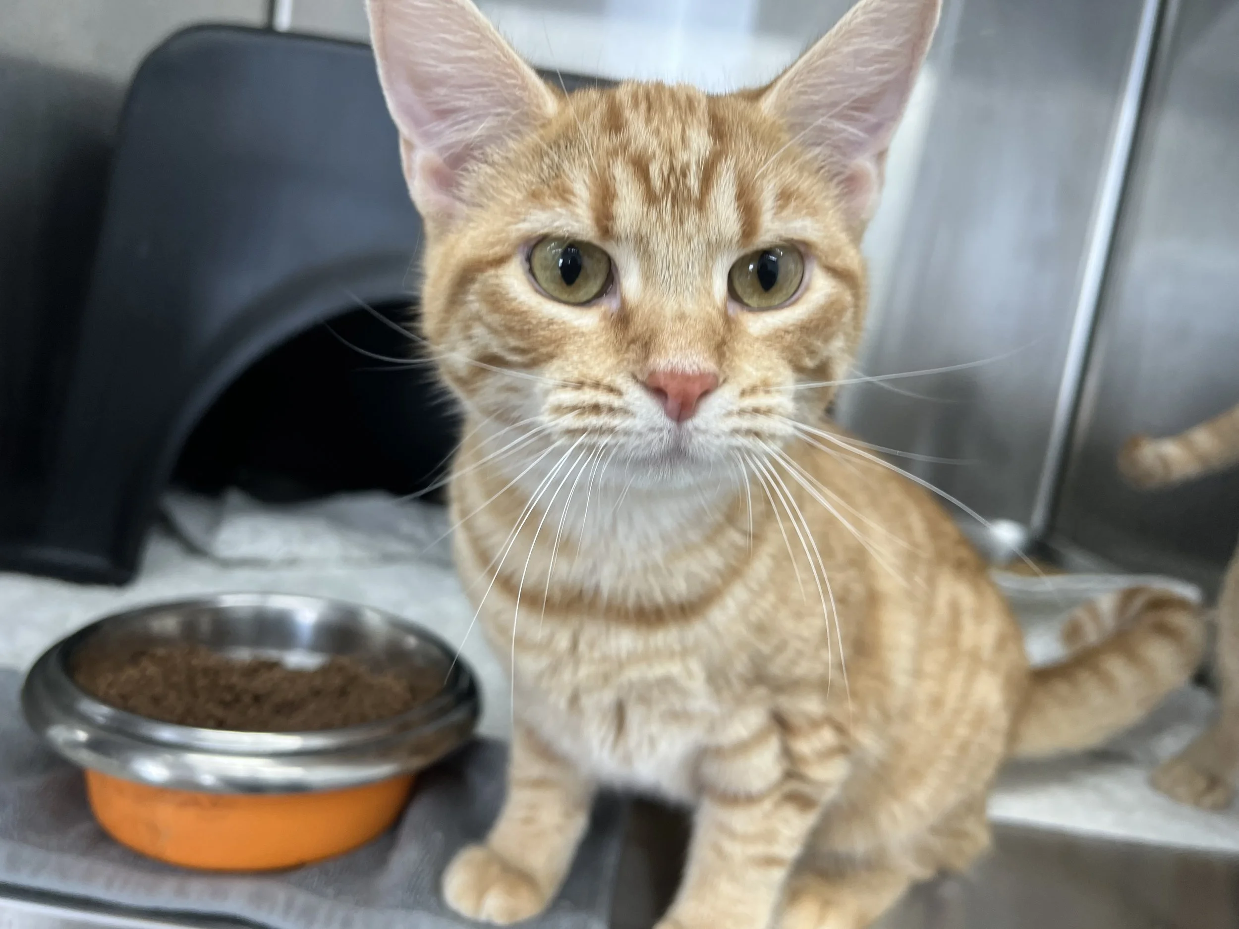Peaches has come a long way since being relinquished to the Shelter. She loves to be petted. She does require special urinary care cat food, so she needs to be an only cat or needs to share her forever home with another cat who will eat the same food. Peaches is estimated to be a little over a year old.