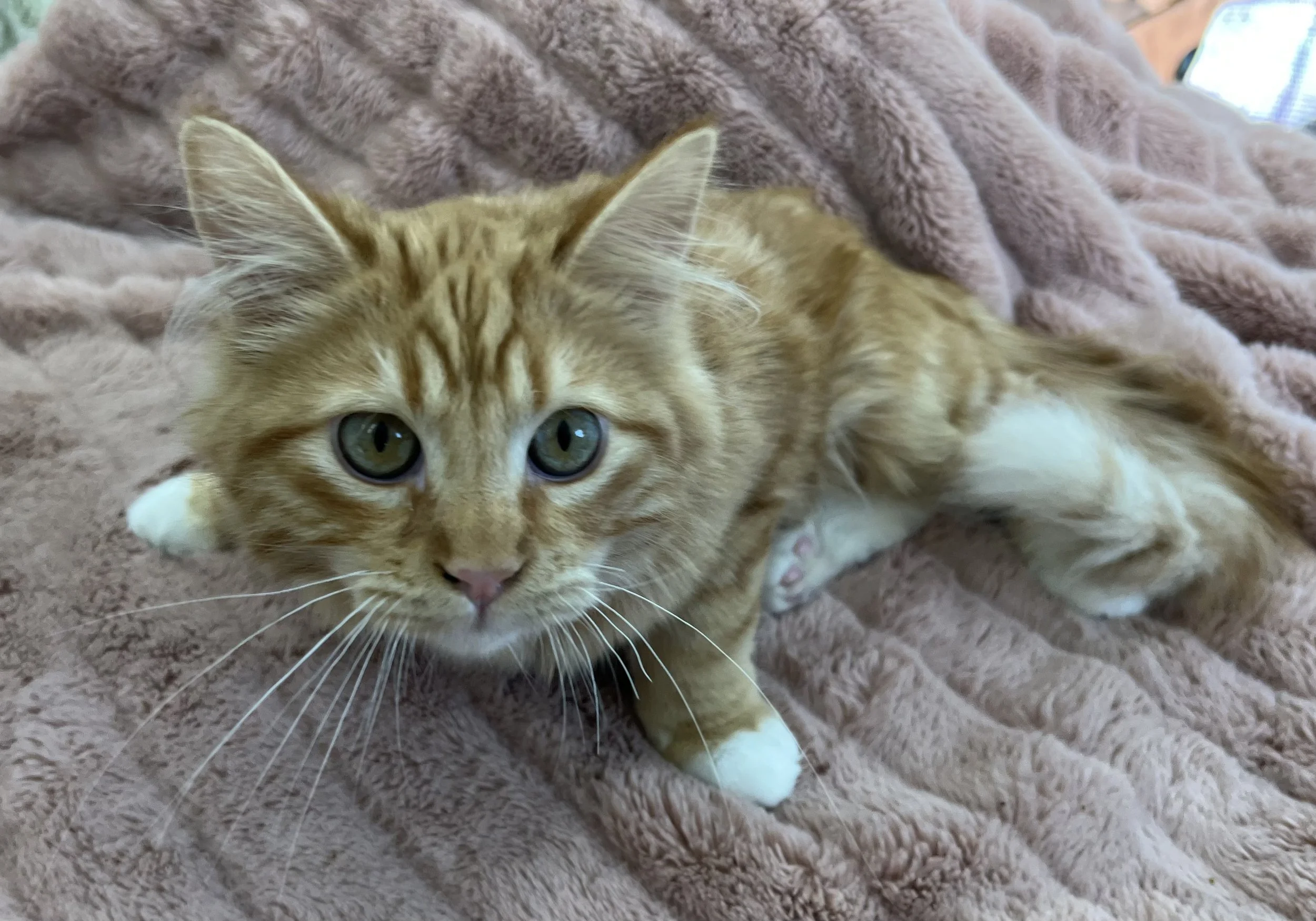 Description: Orange Tabby with white paws and throat.